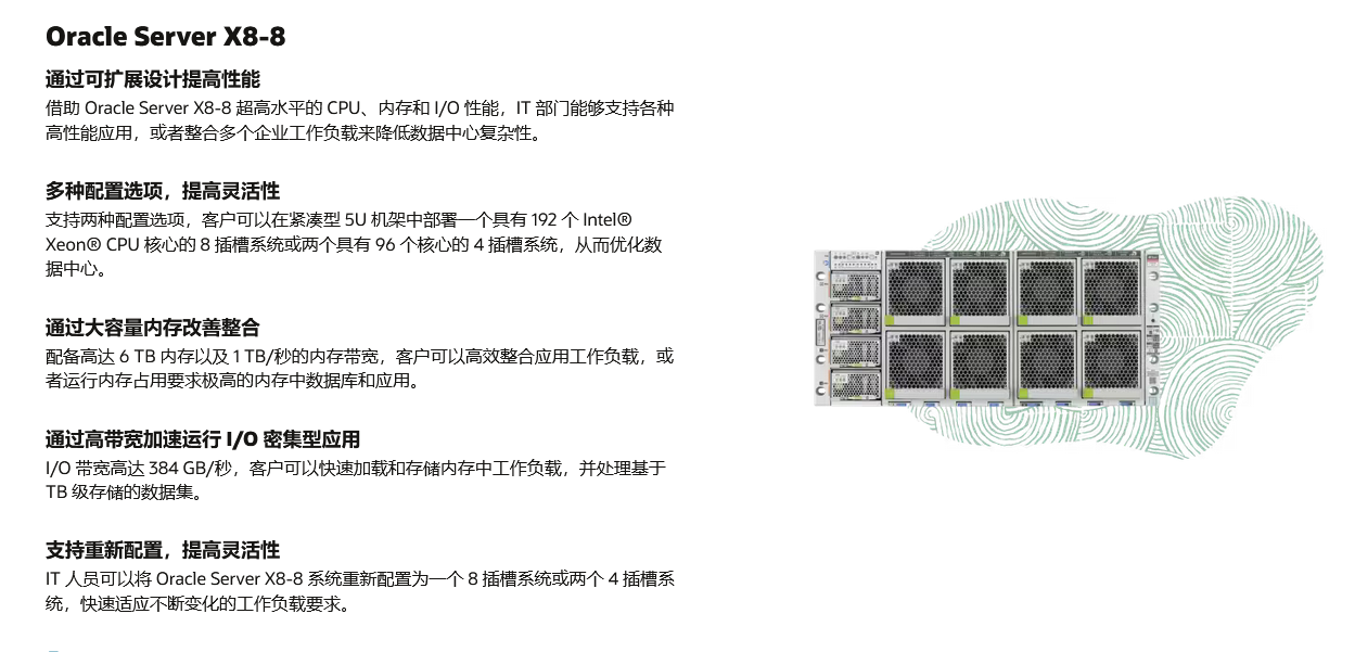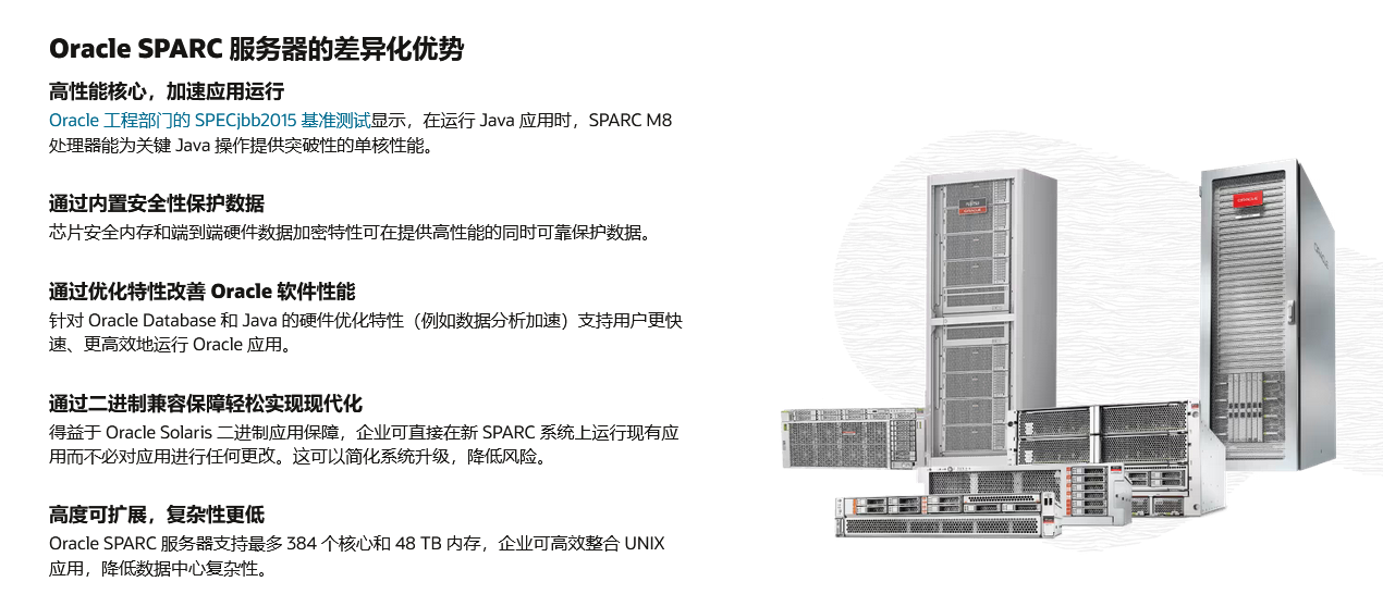 Oracle 服務器能夠以突破性的性能、成本效率和安全性,滿足關鍵業務工作負載的需求。所有 Oracle 服務器都可以有效提高 Oracle 應用的正常運行時間,獨有的內置加速器可將基于 Oracle SPARC 服務器的 Java 應用運行速度得到提升。
